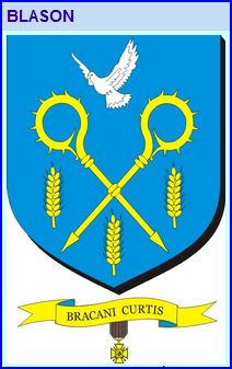 D'azur à deux crosses d'abbé d'or passées en sautoir, accompagnées en flancs et en pointe de trois épis de blé du même et en chef d'une colombe d'argent en vol.