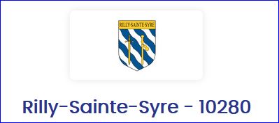 D'azur à quatre bandes ondées d'argent, à l'épée basse d'or à dextre et au bourdon de pèlerin du même à senestre, brochant sur le tout; au comble d'or chargé de l'inscription « RILLY-SAINTE-SYRE » en lettres capitales de sable.