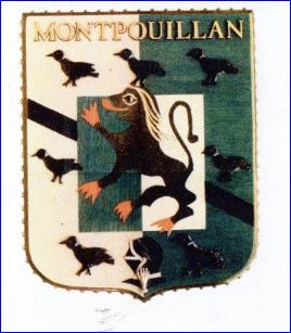 Parti d'argent et de sinople, à la cotice de sable abaissée à dextre et haussée à senestre brochante; sur le tout, un écu en bannière parti de l'un en l'autre, accompagné de six oiseaux de sable ordonnés en orle et en pointe d'un casque du même taré de profil orné d'argent et surchargé d'un gantelet du même posé en pal sur le col, le tout brochant; sur le tout du tout, un lion de sable, armé et lampassé de gueules, brochant.