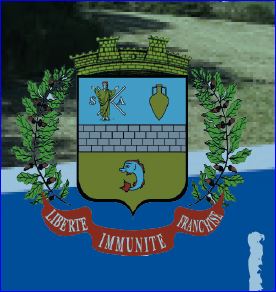 Coupé: au 1er d'azur à chargé, à dextre, de saint André de carnation, vêtu d'or, brochant sur un flanchis d'argent accosté des lettres capitales S et A du même et, à senestre, d'une amphore d'or, au 2e d'or au dauphin d'azur, barbé, crêté, lorré, oreillé et peautré de gueules; à la fasce d'argent maçonnée de sable brochant sur la partition.