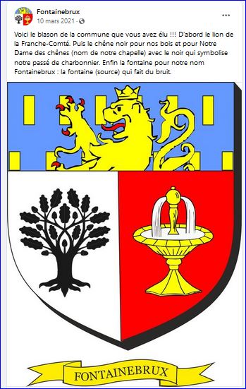 (2021) Parti: au 1er d'argent au chêne de sable, au 2e d'or à la fontaine d'or jaillissant d'argent; le tout sommé d'un chef d'azur semé de billettes d'or au lion couronné issant du même, armé et lampassé de gueules.