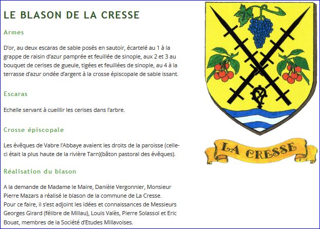 D'or, au deux escaras [échelle servant à cueillir les cerises dans l'arbre] de sable passés en sautoir, cantonnés au 1er d'une grappe de raisin d'azur pamprée et feuillée de sinople, aux 2e et 3e d'un bouquet de cerises de gueules, tigé et feuillé de sinople, au 4e d'une volute de crosse contournée de sable mouvant d'une terrasse fascée ondée d'azur et d'argent de quatre pièces.