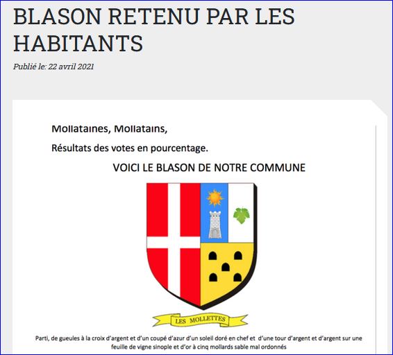 (2021) Parti: au 1er de gueules à la croix d'argent, au 2e coupé, au I reparti d'azur à la tour d'argent maçonnée de sable, surmontée d'un soleil non figuré d'or et d'argent à la feuille de vigne versée de sinople, au II d'or à cinq mollards de sable ordonnés en sautoir.