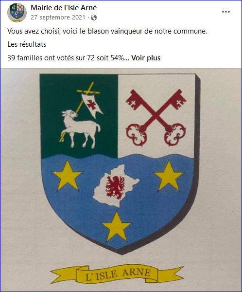 (2021) Coupé ondé: au 1er parti au I de sinople à l'agneau pascal d'argent, la tête contournée, tenant une croix haute d'or à laquelle est appendue une bannière d'argent à la croisette de gueules, au II d'argent à deux clés de gueules passées en sautoir, au 2e d'azur au plan de la commune d'argent chargé d'un lionceau de gueules et accompagné de trois étoiles d'or.