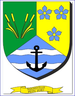 (2021) Tiercé en pairle renversé: au 1er de sinople à quatre roseaux à massettes d'or, au 2e d'or à trois quintefeuilles d'azur, au 3e d'azur à deux fasces ondées d'argent et à l'ancre de sable brochant sur les fasces.