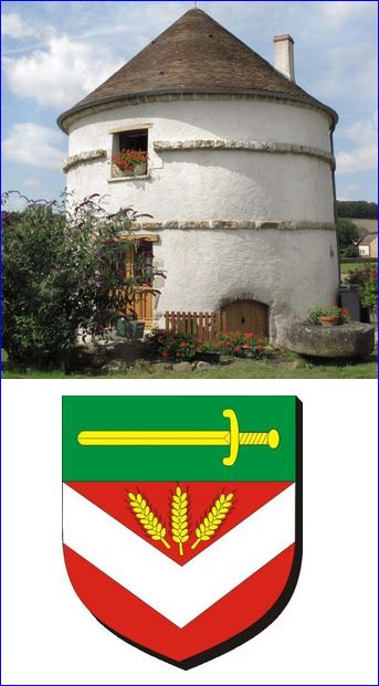 De gueules au chevron renversé d'argent surmonté de trois épis de blé d'or, posés en bande, pal et barre; au chef cousu de sinople chargé d'une épée d'or posée en fasce.