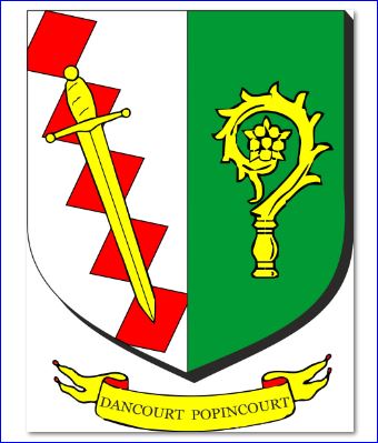 (2021) Parti: au 1er d'argent à la bande de cinq fusées de gueules accolées et posées en barre et à l'épée basse d'or posée en bande brochant, au 2e de sinople à la volute de crosse d'or.
