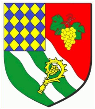 Tranché: au 1er de gueules à la grappe de raisin d'or tigée et feuillée au naturel, au 2e de sinople; à deux cotices ondées d'argent l'une chargeant le sinople, l'autre brochant sur la partition; à la volute de crosse d'or posée en barre et brochant en pointe; au franc-quartier losangé d'azur et d'or.