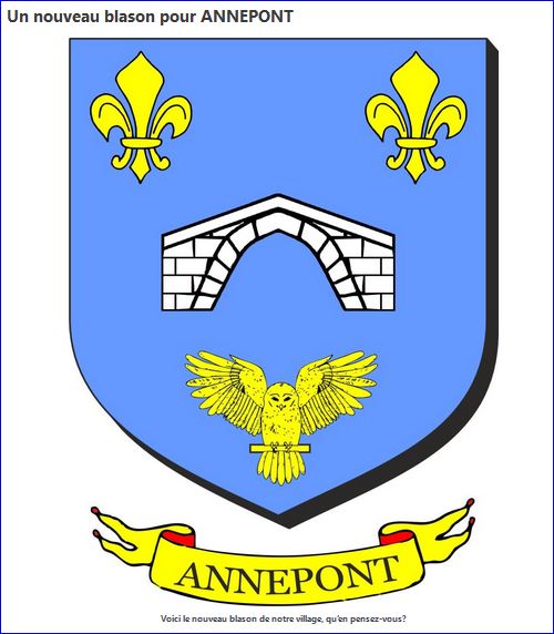 D'azur au pont isolé d'une arche de sable maçonné d'argent, accompagné en chef de deux fleurs de lis d'or et en pointe d'une chouette éployée d'or empiétant un bâton en fasce alésé du même.