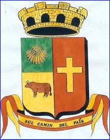 Parti: au 1er coupé au I de sinople à la coquille d'or, au II d'or au boeuf arrêté de tenné, accorné et onglé d'argent, au 2e de gueules à la croix latine alésée d'or.