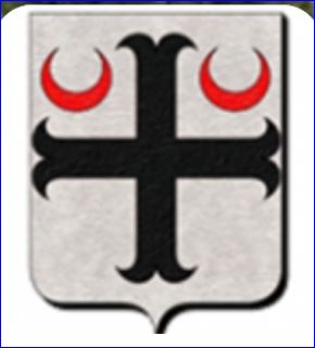 D'argent à la croix ancrée de sable cantonnée en chef de deux croissants de gueules.