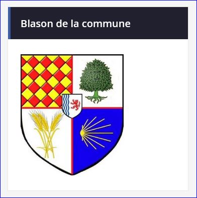 (2020) Écartelé: au 1er losangé d'or et de gueules, au 2e d'argent à l'orme de sinople, au 3e d'argent à trois épis de blé, tigés, feuillés et empoignés d'or, au 4e d'azur à la coquille stylisée de Saint-Jacques-de-Compostelle tournée d'or; sur le tout, d'argent à trois pals ondés d'azur à dextre et au lion de gueules à senestre.