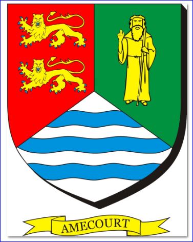 (2021) Tiercé en pairle renversé: au 1er de gueules à deux léopards d'or armés et lampassés d'azur l'un au-dessus l'autre, au 2e de sinople à un saint Hélier en pied d'or, au 3e d'argent à trois fasces ondées d'azur.