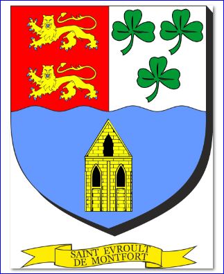 (2021) Coupé ondé: au 1er parti au I de gueules à deux léopards d'or armés et lampassés d'azur l'un au-dessus de l'autre, au II d'argent à trois trèfles de sinople, au 2e d'azur au portail de l'église du lieu d'or maçonné et ajouré de sable.