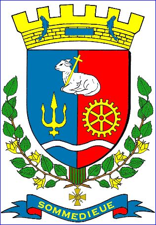 (2022) Parti d'azur et de gueules, à l'agneau couché d'argent portant une croix latine d'or, brochant en chef, à la trangle ondée d'argent brochant en pointe, surmontée à dextre d'un fer de trident et à senestre d'une roue dentée, les deux d'or.