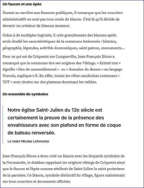(2020) Parti: au 1er de sinople au faucon d'or, la tête contournée, au 2e de gueules à l'épée basse d'argent posée en barre; le tout sommé d'un chef d'azur chargé d'un drakkar d'or, la voile de gueules chargée de deux léopards d'or armés et lampassés d'azur, l'un au dessus de l'autre.