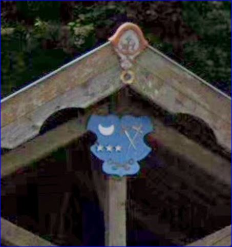 D'azur chargé, à dextre, d'un croissant d'argent en chef soutenu de trois étoiles du même rangées en fasce, à senestre, de deux épées passées d'argent, garnies d'or et passées en sautoir et, en pointe, de deux clés versées d'or passées en sautoir.