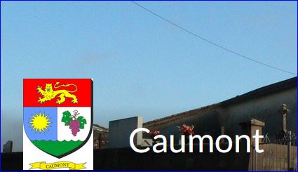 Parti: au 1er d'azur au soleil non figuré d'or, au 2e d'argent à la grappe de raisin de pourpre tigée et feuillée au naturel; le tout à la terrasse engrelée de sinople et au chef de gueules chargé d'un léopard d'or, armé et lampassé d'azur.