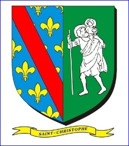 Parti: au 1er d'azur semé de fleurs de lis d'or, à la bande de gueules;, au 2e de sinople à saint Christophe d'argent.