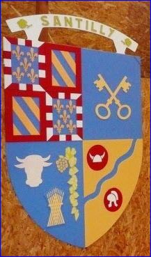 Écartelé: au 1er contre-écartelé aux I et IV d'azur semé de fleurs de lis d'or et à la bordure componée de gueules et d'argent, aux II et III bandé d'azur et d'or et à la bordure de gueules, au 2e d'azur à deux clés d'or passées en sautoir, au 3e d'azur au rencontre de vache d'argent en chef dextre, au cep tuteuré d'or fruit d'une pièce du même à senestre et à la gerbe de blé d'or en pointe, au 4e d'or au filet ondé en barre d'azur accompagné de deux tourteaux de gueules chargés, celui du chef, d'un casque gaulois d'argent et celui de la pointe d'un casque romain du même.