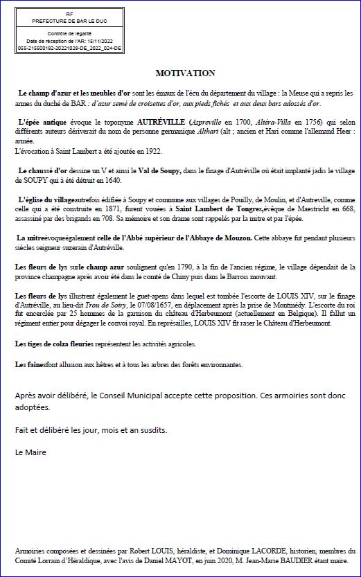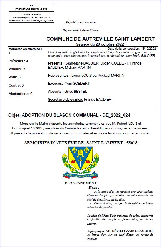 (2022) D'azur à la mitre d'or accompagnée en chef de deux fleurs de lis d'or et en pointe d'une épée antique basse d'argent garnie d'or; chaussé d'or, chargé de deux faines éclatées adossées de gueules.