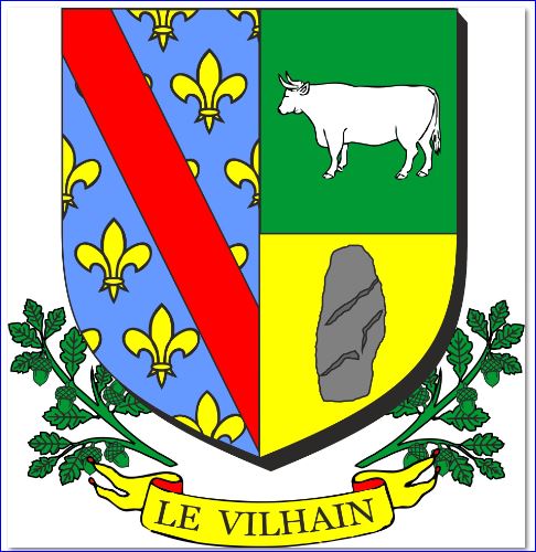(2022) Parti: au 1er d'azur semé de fleur de lis d'or, à la bande de gueules, au 2e coupé au I de sinople au bœuf arrêté d'argent, au II d’or au menhir au naturel.