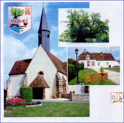 Parti d'azur et d'argent: le 1er chargé en chef du gros chêne, arbre remarquable du lieu, de sinople futé de sable brochant en partie sur le 2e du parti, le 2e chargé en chef d'un écusson d'argent à trois chevrons de gueules timbré d'une couronne de comte; le tout accompagné en pointe d'un bourg d'argent brochant, couvert, ouvert et ajouré de sable aux buissons du même, soutenu de deux glands, chacun feuillé d'une pièce, de sinople passés en sautoir; à l'inscription en lettres capitales « MEAUCÉ » de gueules brochant en fasce sur le tout.