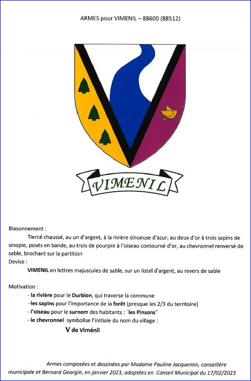 (2023) Tiercé chaussé: au 1e d'argent à la rivière sinueuse d'azur posée en pal, au 2e d'or à trois sapins de sinople rangés en bande, au 3e de pourpre à l'oiseau d'or contourné en vol; au chevronnel renversé de sable brochant sur la partition.