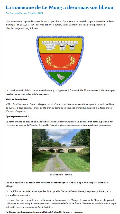 (2023) Tiercé en fasce: au 1er d'or au pont alésé de deux arches et deux demies du lieu au naturel, maçonné de sable, au 2e de gueules à deux épis de blé tigés et feuillés d'or, courbés, les tiges passées en sautoir, chargés de vingt-et-un grains, dix à dextre et onze à senestre, au 3e de sinople à la grenouille d'argent et au chef rompu cousu d'azur ondé d'argent, combiné avec une filière de même, à savoir d'azur ondée d'argent, bordant le tout.
