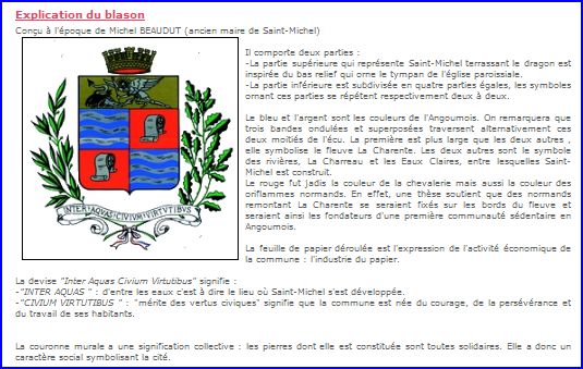 Écartelé: aux 1er et 4e d'azur à trois fasces ondées d'argent, aux 2e et 3e de gueules au rouleau à papier d'argent; le tout sommé d'un chef d'or à saint Michel terrassant un dragon, le tout d'argent.