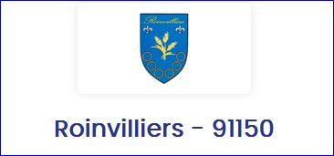 D'azur à trois épis de blé tigés, feuillés et empoignés, d'or, accompagnés, en chef et en flancs, de deux fleurs de lis d'argent surmontées de l'inscription « Roinvilliers » en lettres cursives d'or et, en pointe, de six annelets du même ordonnés en orle.