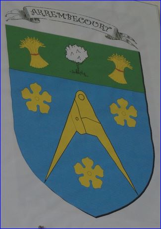 D'azur au compas d'or ouvert en chevron accompagné de trois quintefeuilles boutonnées du même; au chef d'or chargé d'un arbre de sinople futée de tenné et accosté de deux gerbes de blés de sinople, celle de dextre posée en bande et celle de senestre posée en barre.