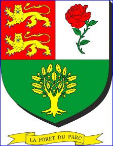 Coupé: au 1er parti au I de gueules à deux léopards d'or armés et lampassés d'azur l'un au-dessus de l'autre, au II d'argent à la rose des jardins de gueules, tigée et feuillée de sinople, au 3e de sinople au chêne d'or.