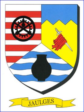 Tiercé en pairle renversé: au 1er d'argent à cinq burelles de gueules et à deux canons passés en sautoir surmontés d'une grenade, brochant sur une roue dentée, le tout de sable enfermé dans un cyclamor du même et brochant sur les burelles; au 2e d'or à l'épée basse d'argent posée en bande et supportant un manteau de gueules posé en barre et au chef émanché d'azur, au 3e d'argent à trois fasces ondées d'azur et à la poterie de sable brochant sur les fasces.