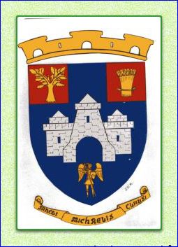(1986) D'azur au donjon couvert d'argent, ouvert et ajouré du champ, flanqué de deux tours couvertes d'argent, ajourées du champ, le tout maçonné de sable, soutenu de l'archange saint Michel d'or; au franc-canton dextre cousu de gueules chargé d'un chêne d'or et au franc-canton senestre cousu de gueules chargé d'une gerbe de blé d'or.