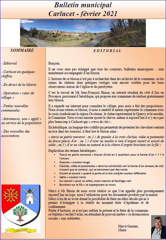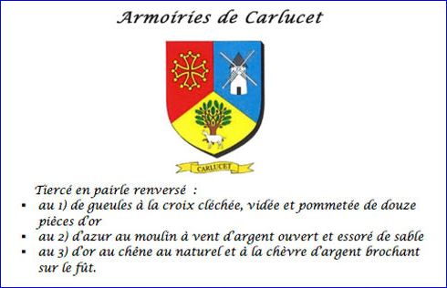 (2020) Tiercé en pairle renversé: au 1er de gueules à la croix cléchée, vidée et pommetée de douze pièces d'or, au 2e d'azur au moulin à vent d'argent, ouvert et essoré de sable, au 3e d'or au chêne au naturel et à la chèvre d'argent arrêtée et brochant sur le fût.