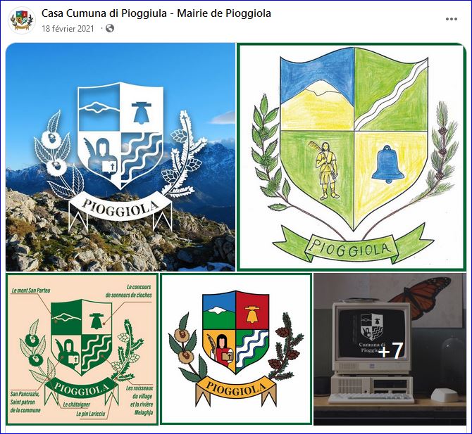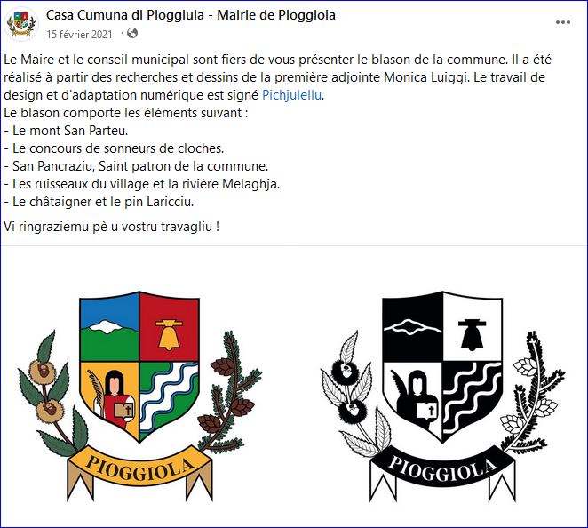 (2021) Écartelé: au 1er d'azur à la montagne de sinople, le sommet enneigé d'argent, au 2e de gueules à la cloche d'or, au 3e d'or à san Pancraziu de carnation, chevelé de sable, à mi-corps mouvant de la pointe, vêtu d'argent et d'un camail de gueules, tenant dans sa dextre une palme d'or et dans sa senestre un livre ouvert du même chargé à senestre d'une croix latine de sable, au 3e de sinople à trois filets d'azur ondés en barre, l'intervalle entre les filets rempli d'argent.