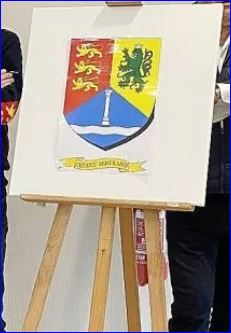 (2023) Tiercé en pairle renversé: au 1e de gueules à trois léopards d'or, l'un au-dessus de l'autre, au 2e d'or au lion de sinople couronné d'argent, au 3e d'azur à la burelle ondée abaissée d'argent et surmontée d'une colonne du même.