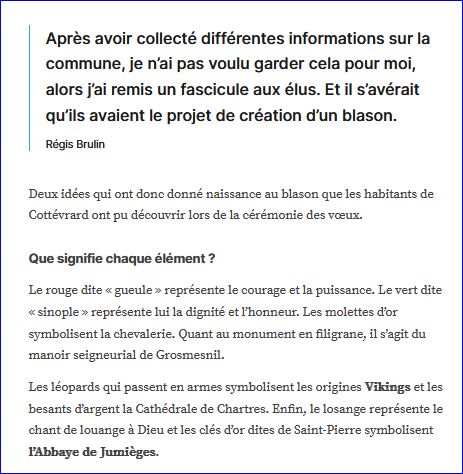(2024) De gueule à la losange d'argent accostée de deux léopards d'or en chef, à deux besants d'argent, chargé chacun d'une inscription de sable frappé au droit d'un denier du Moyen âge du type bléso-chartrain en flancs sous les léopards et accompagnés en pointe de deux clés renversées et adossées d'or; au chef cousu de sinople chargé du manoir de Grosmesnil en ombre de sable accosté de deux molettes d'or boutonnées d'argent.