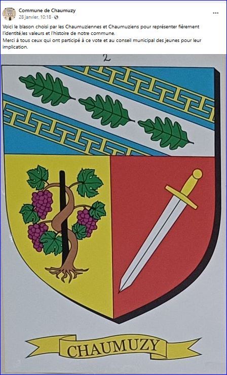 (2024) Parti: au 1er d'or au cep de vigne de tenné, feuillé de sinople, fruité de gueules et tuteuré de sable, au 2e de gueules à l'épée basse d'argent, garnie d'or et posée en barre; le tout sommé d'un chef d'azur à la bande d'argent chargée de trois feuilles de chêne de sinople et côtoyée de deux jumelles potencées contre-potencées intérieurement d'or.