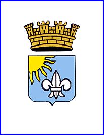 D'azur à la fleur de lis d'argent accompagnée d'un soleil levant d'or.
