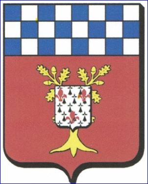 De gueules au chêne d'or et à l'écu d'hermine à trois fleurs de lis au pied nourri de gueules, brochant en coeur; au chef échiqueté d'azur et d'argent.