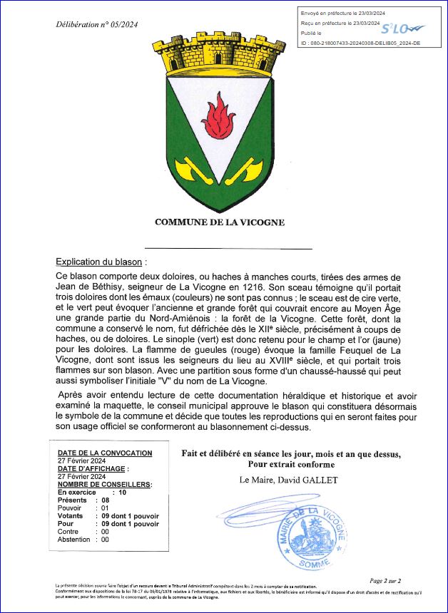 (2024) D'argent à la flamme de gueules; chaussé haussé de sinople chargé de deux doloires adossées d'or, celle de dextre posée en bande et celle de senestre posée en barre.