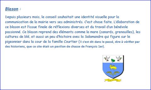 D'azur à la salamandre couronnée d'or, la tête contournée et vomissant des flammes du même, accompagnée en pointe de deux épis de blé, ployés, et empoignés d'or; au chef d'argent chargé d'une grenouille de sinople accostée de deux canards colverts essorants, adossés au naturel.