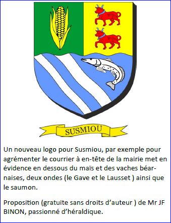 (2024) Coupé ondé: au 1er parti au I de sinople à l'épi de maïs d'or, au II d'or à deux vaches de gueules accornées, accolées et clarinées d'azur, l'une au-dessus de l'autre, au 2e d'azur à la bande ondée réduite d'argent côtoyée à dextre d'une cotice et senestrée d'un saumon courbé en bande, le tout du même.