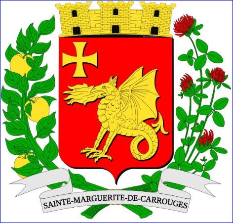 De gueules au dragon accroupi et crachant des flammes d'or accompagné d'une croisette pattée du même au canton dextre du chef.
