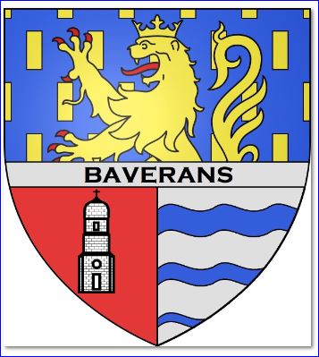 Coupé: au 1er mi-coupé d'azur semé de billettes d'or au lion couronné du même, armé et lampassé de gueules, au 2e parti au I de gueules à la façade de l'église du lieu d'argent maçonnée de sable, au II d'argent à une fasce, une burelle et une trangle, les trois ondées d'azur; à la divise d'argent chargée de l'inscription « BAVERANS » en lettres capitales de sable, brochant sur la partition.