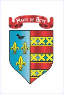 Parti: au 1er d'azur à trois fleurs de lis d'or surmontées d'une merlette de sable, au 2e de gueules à trois fasces d'azur bordées d'or, chargées, les deux premières de trois flanchis d'or et la troisième de deux flanchis du même.