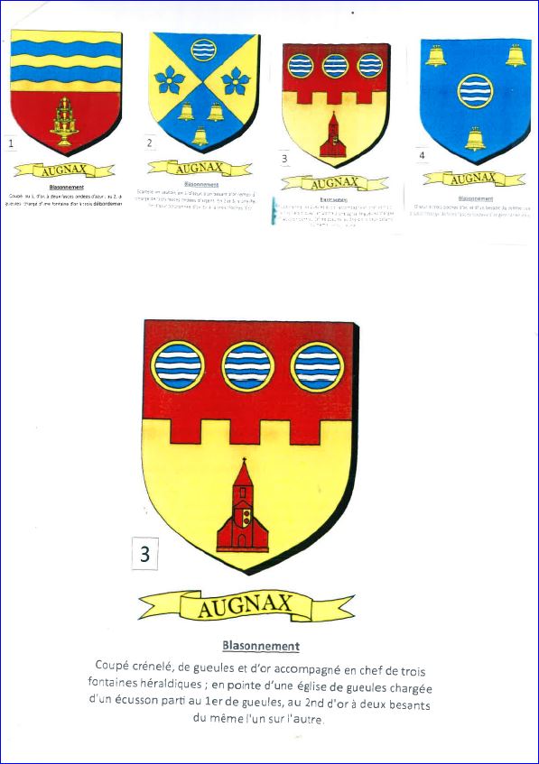 (2024) Coupé crénelé bastillé de trois pièces: au 1er de gueules à trois fontaines héraldiques d'azur, traversées de trois sources d'argent, cerclées d'or et rangées en fasce, au 2e d'or à l'église de gueules chargée d'un écusson parti, au I de gueules plain, au 2 d'or à deux tourteaux de gueules l'un au-dessus de l'autre.