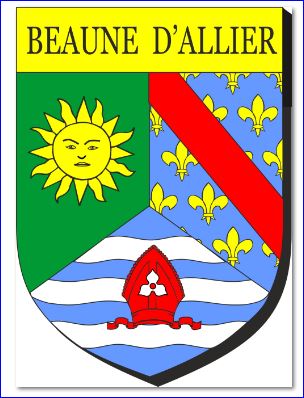 (2024) Tiercé en pairle renversé: au 1er de sinople au soleil d'or, au 2e d'azur semé de fleurs de lis d'or à la bande de gueules, au 3e d'azur à trois fasces ondées d'argent et à la mitre de gueules chargée d’une tiercefeuille d’argent brochant sur les fasces; le tout sommé d'un comble d'or chargé de l'inscription « BEAUNE D'ALLIER » en lettres capitales de sable.